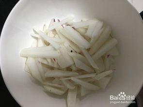 2. 腌制:将切好的萝卜条放入盆中,加入食盐,用手揉搓至萝卜条出水分。